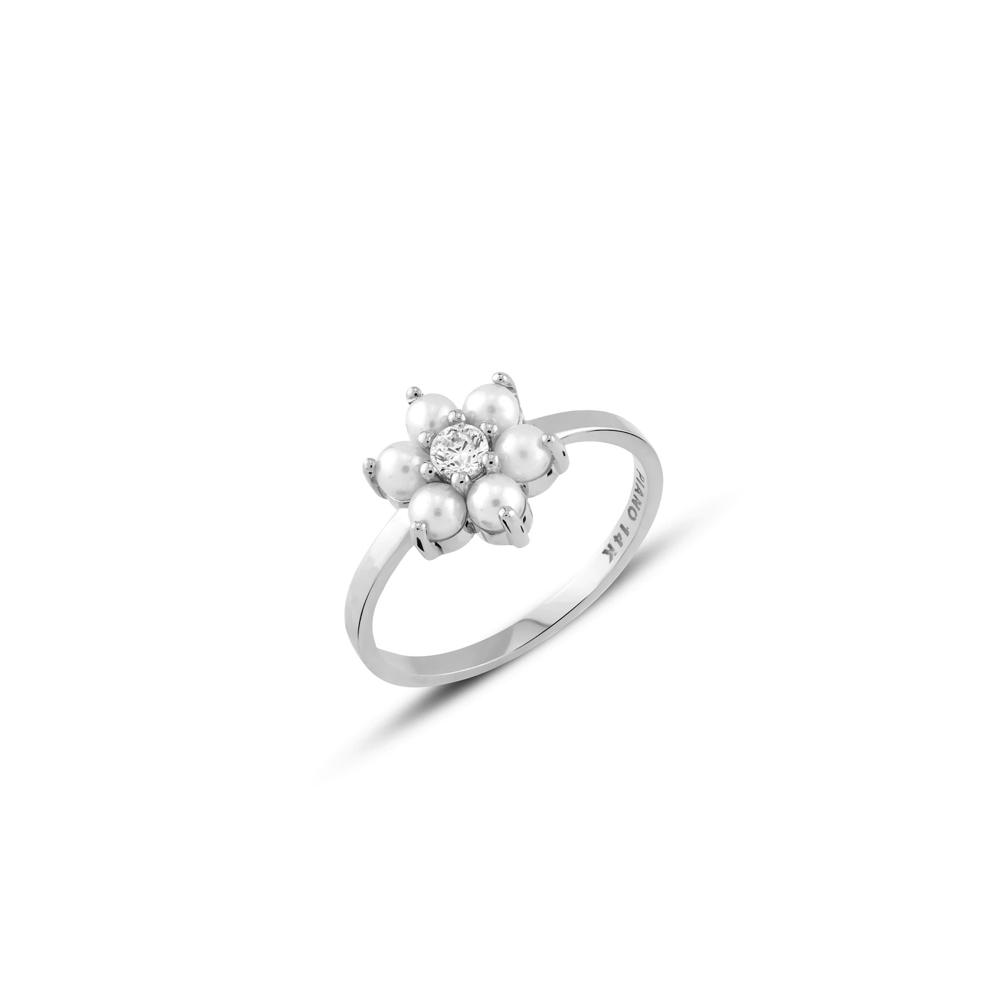 Çiçek Form İncili Altın Yüzük / 14 Ayar Beyaz Altın