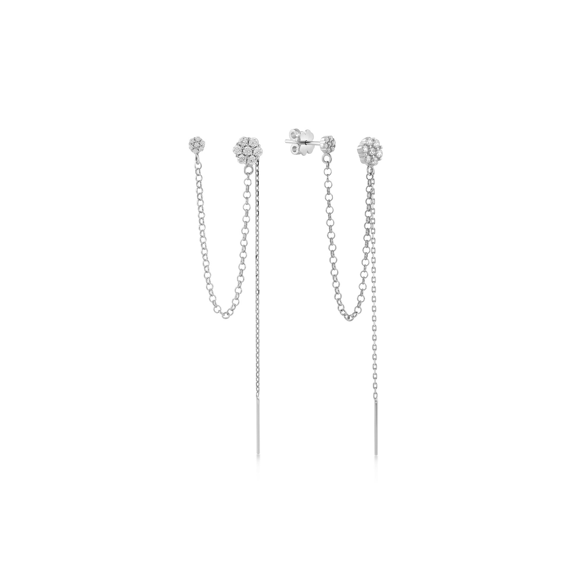 Çiçek Zincir Sallantılı Taşlı Tek Altın Küpe / 14 Ayar Beyaz Altın