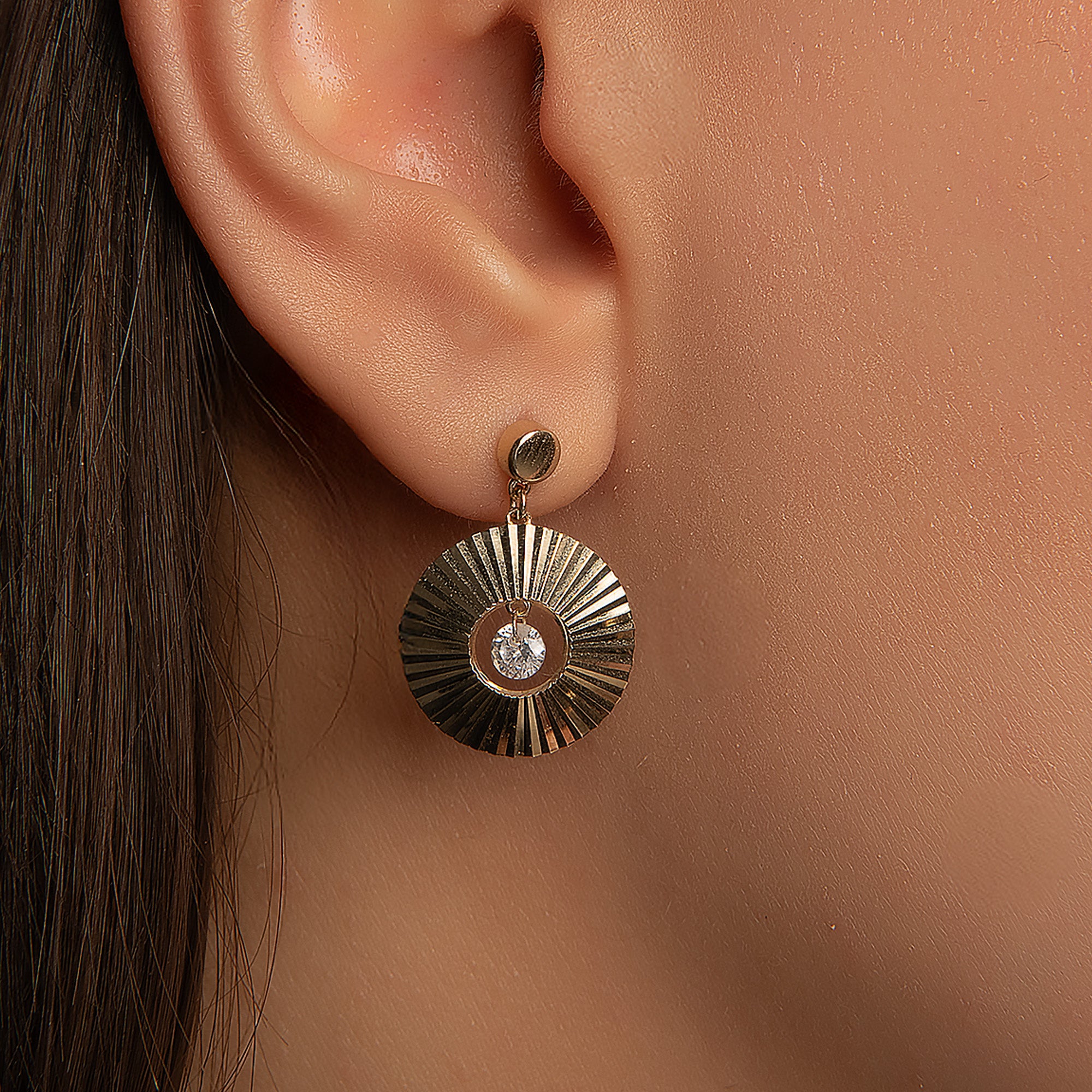 14 ayar altından ustalıkla tasarlanan bu Parasol Tasarım Sallantılı Altın Küpe, güneşin enerjisini ve zarafetini stilinize taşır. Yelpaze formundaki ışınsal altın detaylar, merkezde serbestçe salınan parlak zirkon taş ile birleşerek büyüleyici bir hareket kazanır. Hem modern hem de sofistike bir duruş sergileyen bu altın küpe, her anınıza seçkin bir parıltı ve estetik bir dokunuş katar.
