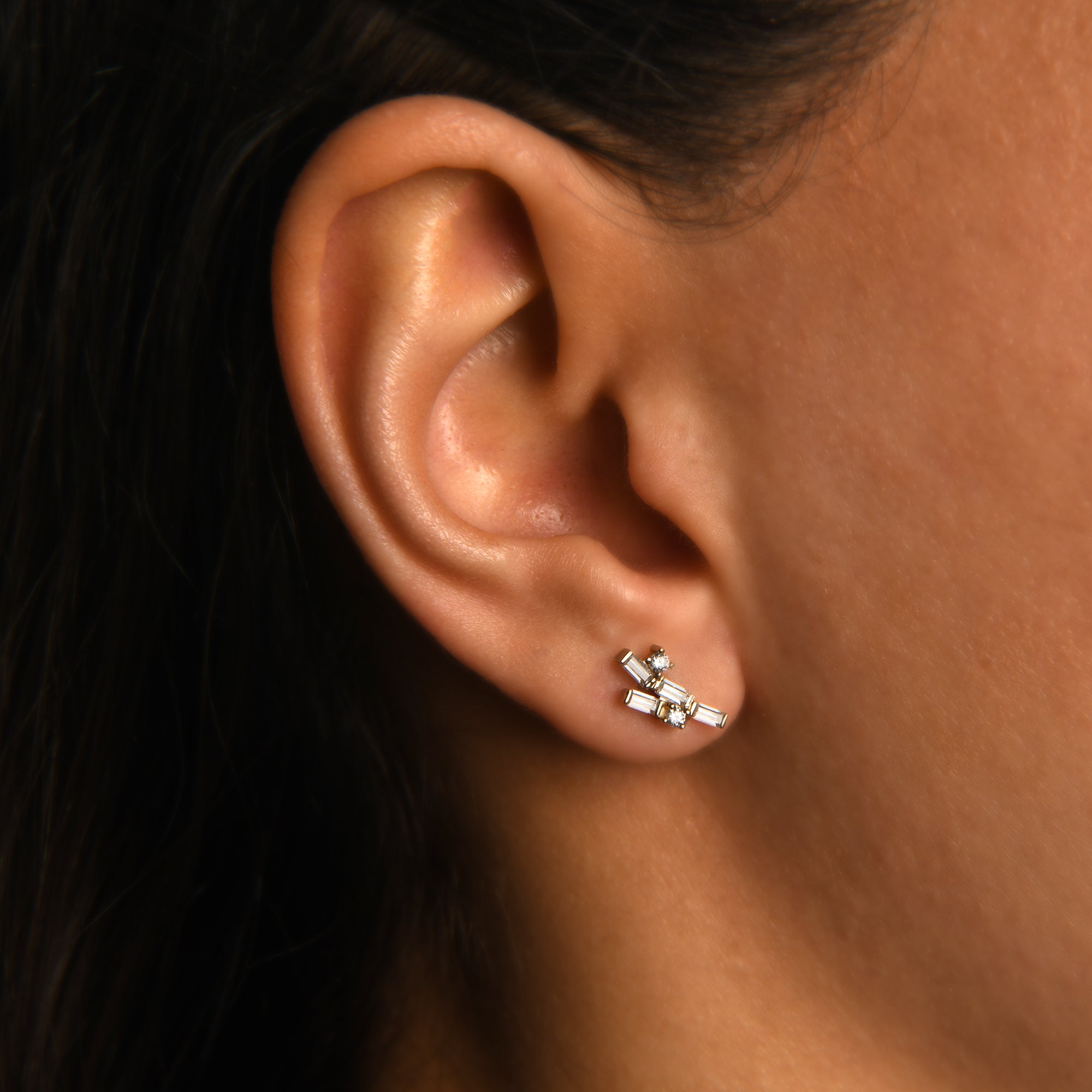 Asimetrik Baget Taşlı Altın Küpe / 14 Ayar Beyaz Altın