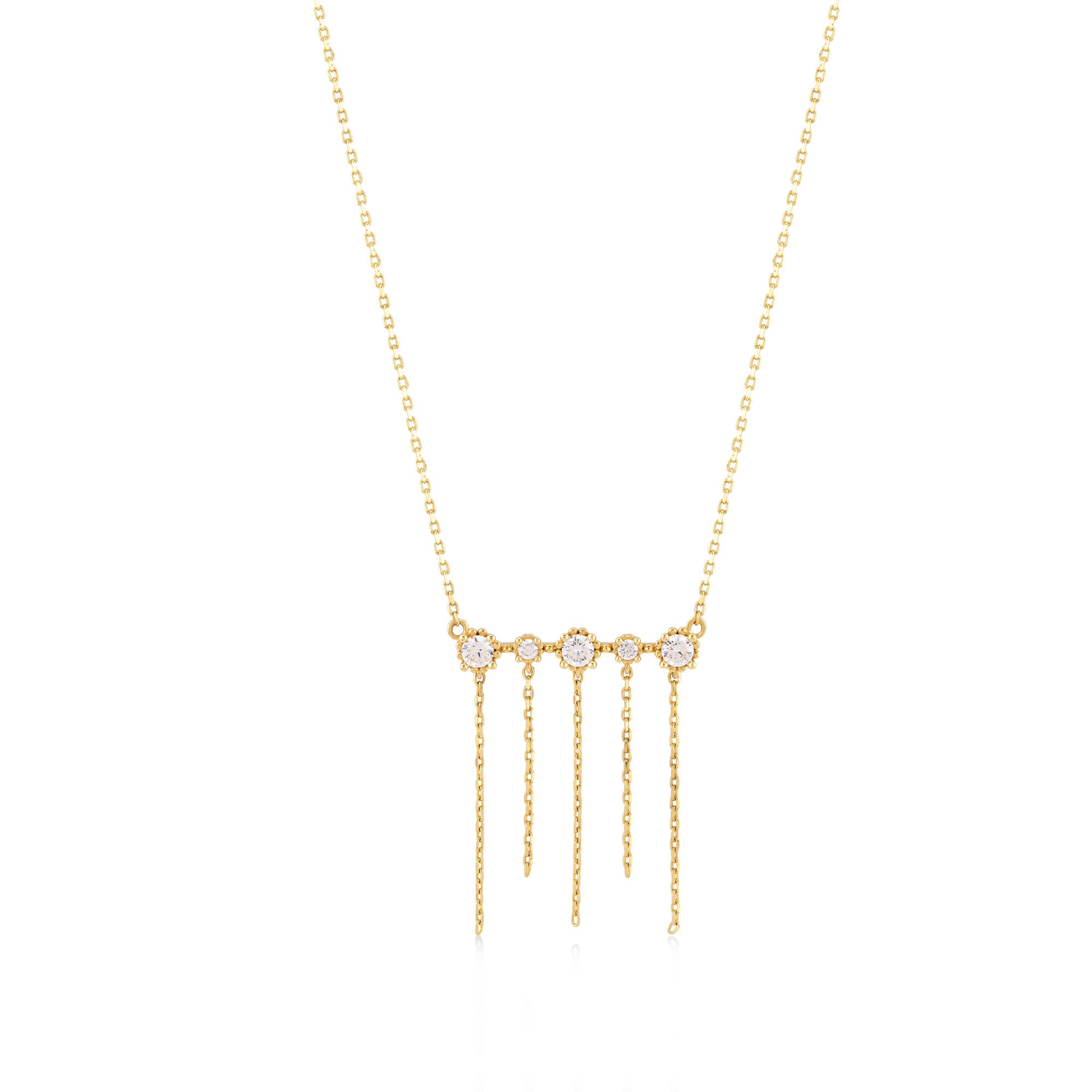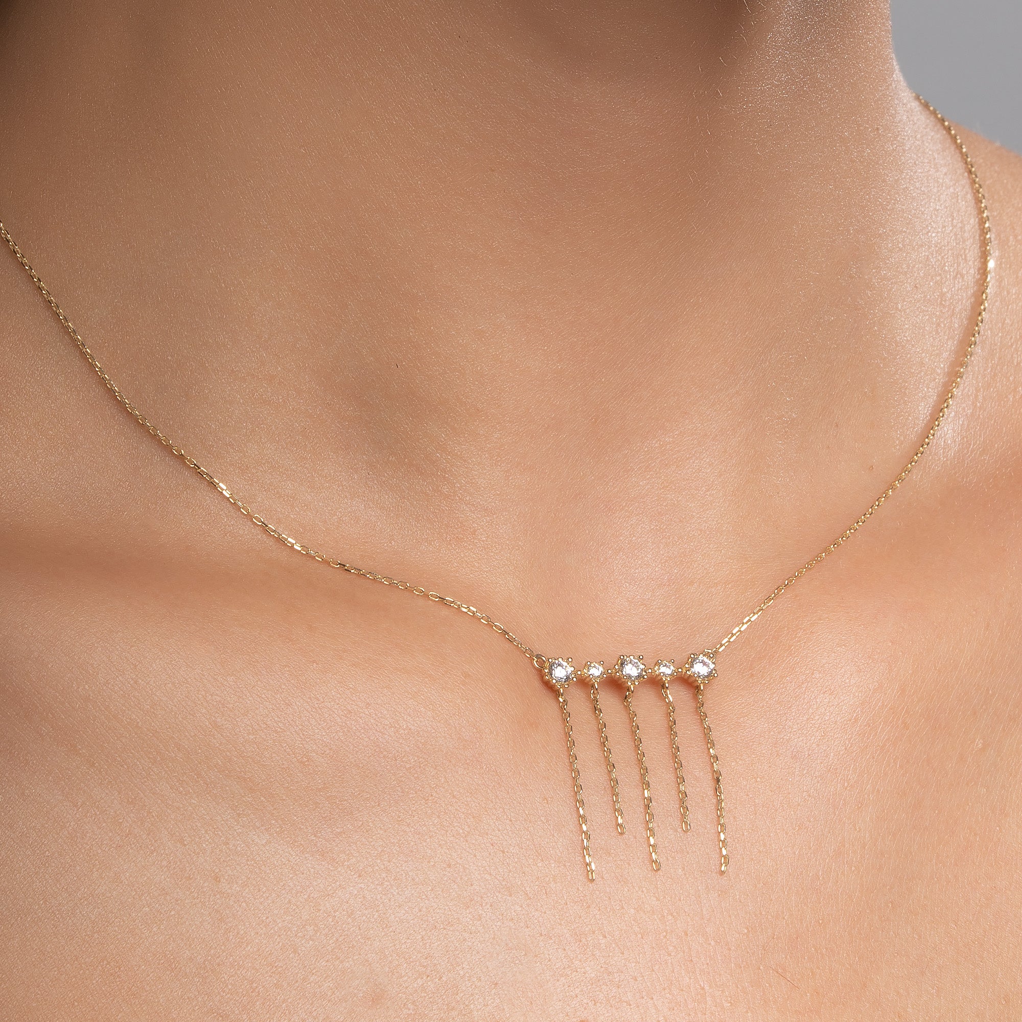 Crafted with elegance in 14-karat gold, this Chain Dangle Necklace with Stones offers captivating style with its dynamic and sparkling structure. The brilliant zircon stones arranged horizontally and the elegant chain details cascading from the gold create a dynamic shimmer around your neck. With its modern and bold design, this gold necklace perfectly complements your style at special events.