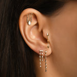 Online'a özel Gaudi Koleksiyonu'nun Art Nouveau zarafetini taşıyan bu 14 ayar sarı altın tek zincir sallantılı piercing, mimari çizgileri teninize taşıyor. Akıcı formu ve ucundaki minimalist geometrik detay ile dinamik ve modern bir görünüm sunar. Helix, conch veya kıkırdak küpe olarak stilinize hareket katacak eşsiz bir altın piercing modelidir.