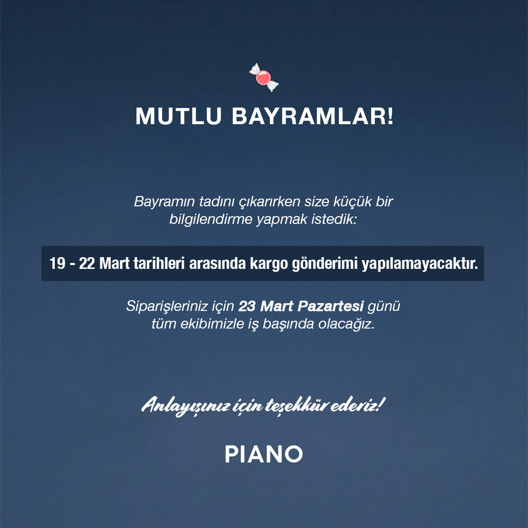 İade etmek istediğiniz siparişlerinizin, size gönderilen şekliyle, ürün, fatura, irsaliye, sertifika, ürün kutusu, ambalajı ve diğer tüm evrak ve materyallerin, eksiksiz ve hasar almamış şekilde, sayfanın altında bulunan adrese gönderilmesi gerekmektedir. İade gönderimi sırasında, kargo firmalarından, ya da iade işlemini gerçekleştiren müşteriden kaynaklanan sebeplerle, ürün ve ürünle birlikte gönderilen evrak ve materyallerde meydana gelen bozulma ya da benzeri değer kaybettirici her türlü durumun sorumluluğu iadeyi gerçekleştiren müşteriye aittir. Bildirim için Müşteri İlişkileri hattımızı arayabilir, ya da shop@pianojewellery.com adresine e-posta gönderebilirsiniz.
