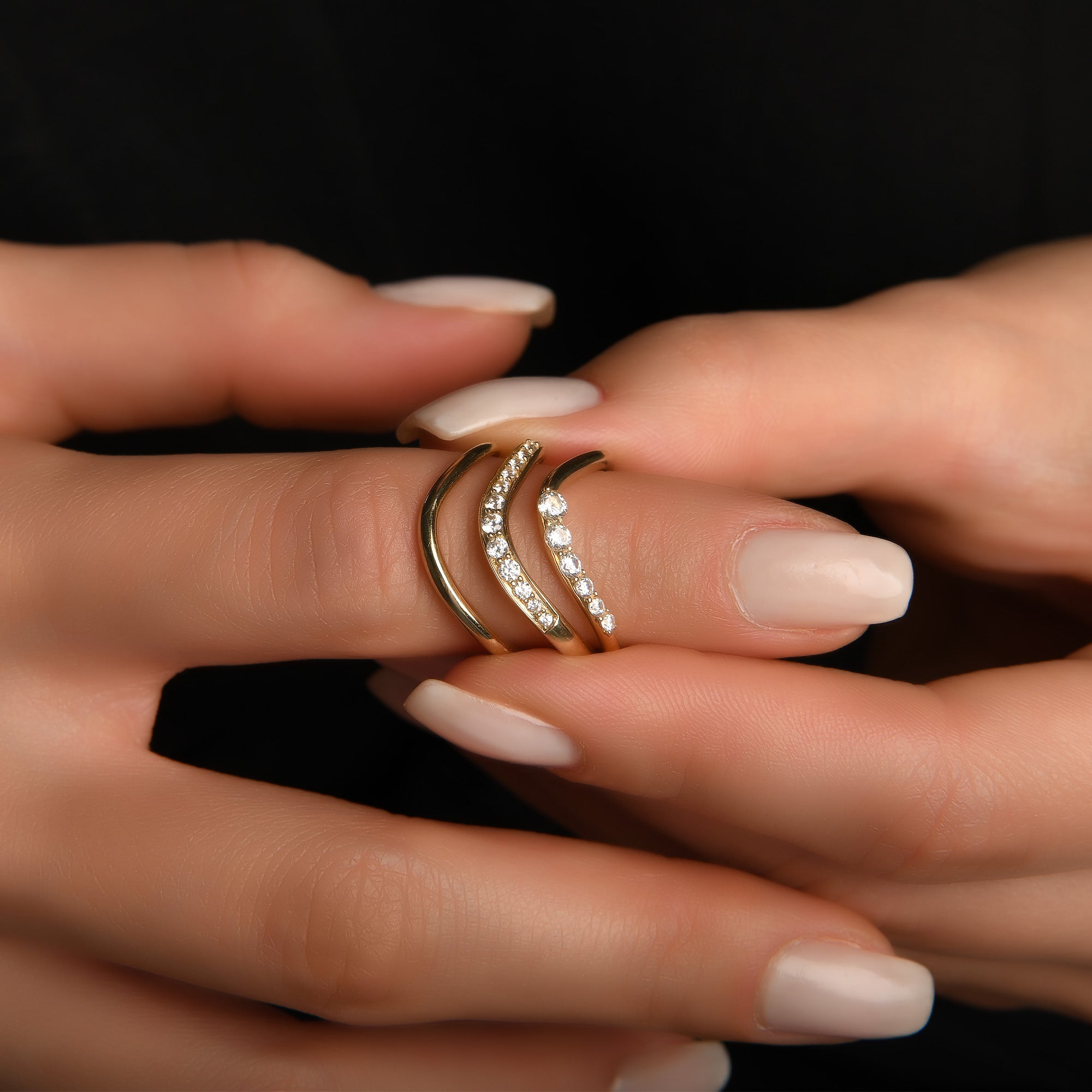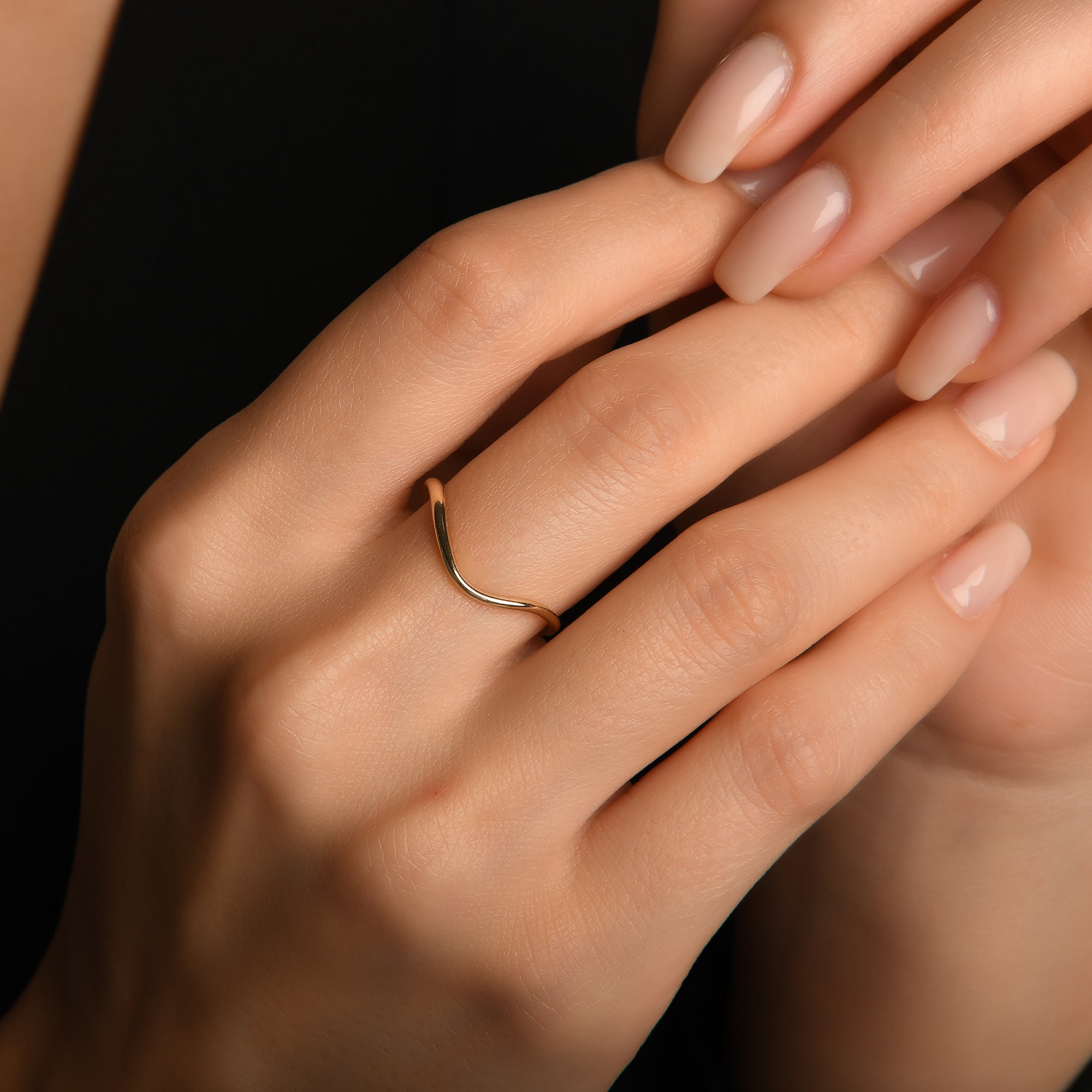Это минималистичное изогнутое кольцо, изготовленное из 14-каратного золота, выделяется своим современным и плавным дизайном. Его элегантная изогнутая форма, лишенная резких линий, удобно сидит на пальце. Идеально подходящее для повседневного ношения, это простое золотое кольцо можно сочетать с другими кольцами или использовать как самостоятельное украшение для создания минималистичного и элегантного образа.