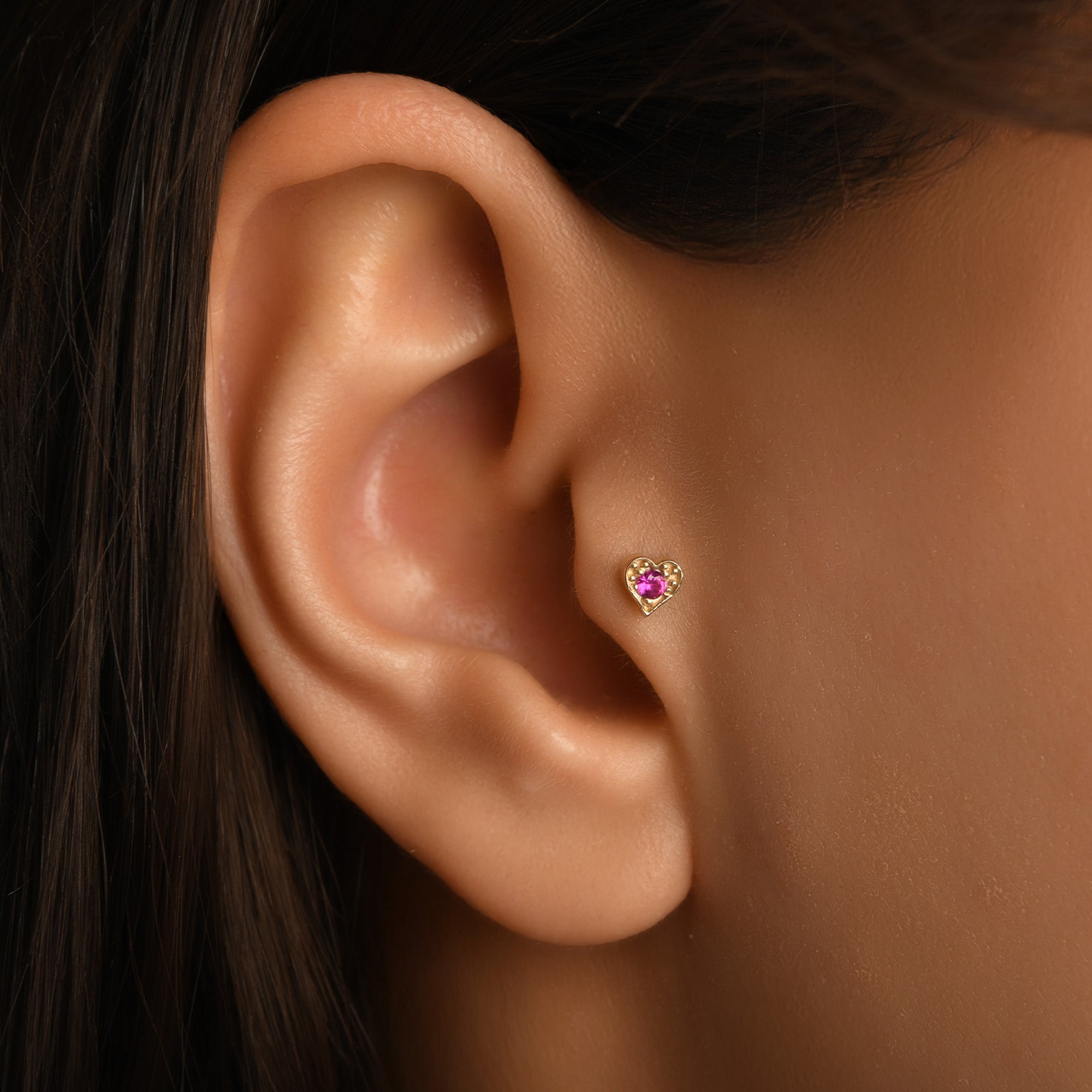 Kupa Kalp Kırmızı Taşlı Altın Piercing / 14 Ayar Rose Altın