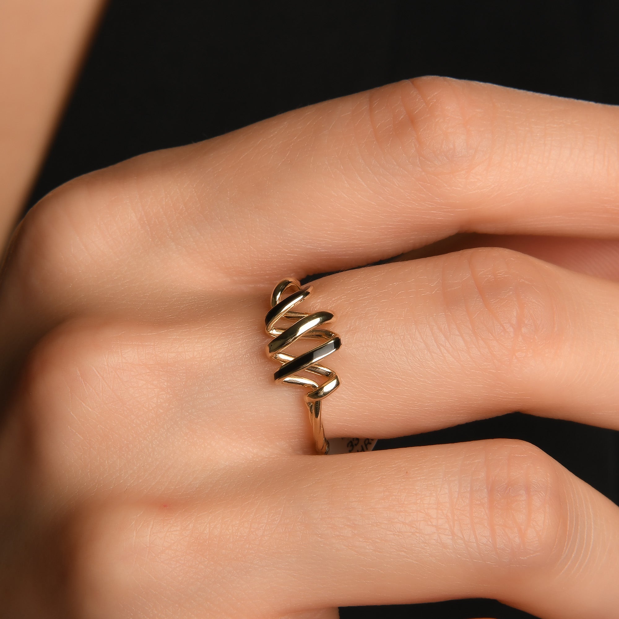 Это золотое кольцо в форме спирали, изготовленное из 14-каратного золота, с эмалевым покрытием, будет выглядеть на вашем пальце особенно эффектно. Его скульптурная спиральная форма привлекает внимание блеском золота и эффектным контрастом чёрной эмали. Это эффектное золотое кольцо идеально подходит для тех, кто ценит современный дизайн и добавляет художественный штрих в свою коллекцию украшений.